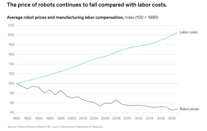 McKinsey在「自动化与美国制造业的人才挑战」报告里就指出,那些例行性、重复性活动最容易被自动化,而一旦这类环节被自动化替代,效率和良品率往往会出现显著提升。
